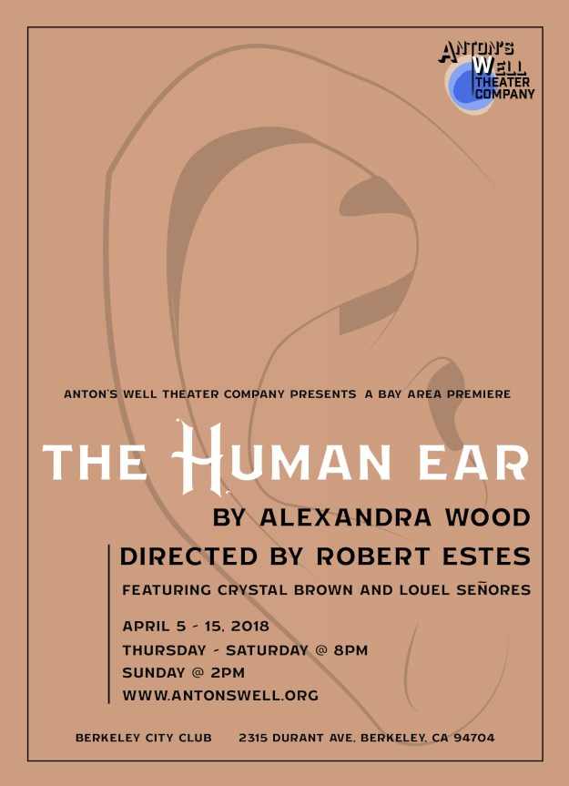 THE HUMAN EAR by Alexandra Wood. Bay Area Premiere. Starring Crystal Brown and Louel Senores. Directed by Robert Estes. April 5-15, 2018. Berkeley City Club.