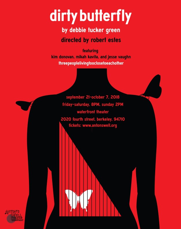 dirty butterfly by debbie tucker green. Bay Area Premiere. Starring Mikah Kavita, Kim Donovan, and Jesse Vaughn. Directed by Robert Estes. September 21-October 7, 2018. Waterfront Theater, 2020 4th Street, Berkeley.